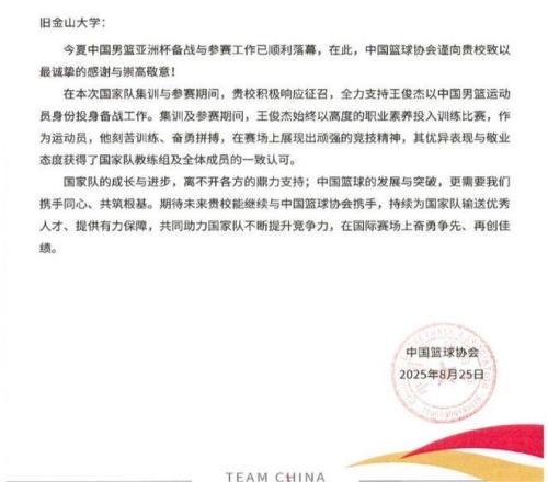 雷速体育10月16日宣 今日,中国篮协官方给旧金山大学发去一封感谢信,在信中对该大学培养球员王俊杰方面所付出的努力表达了高度认可与感谢。