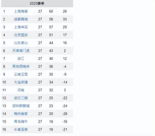 中超最新积分榜