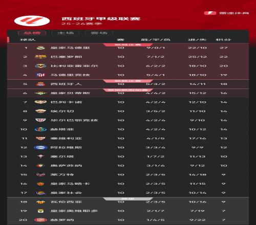 雷速体育10月28日宣 今天凌晨,西甲第10轮最后一场比赛,马竞客场2-0战胜皇家贝蒂斯。在最新积分榜上,赢下国家德比的皇马领衔巴萨5分,继续领跑;比利亚雷亚尔20分排名第三,马竞19分排名第四,西班牙人第五,贝蒂斯第六。